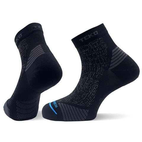 TEKO ecoRUN MINI CREW Light Half Cushion 2.0 socks are the perfect sock for people who love their running and can also be worn for activities such as cycling and gym work. Light cushioning throughout is very comfortable while the Econyl fabric wicks moisture from the foot. Made from the ECONYL Evapor8 fibre, they perform best in warm & humid conditions as they dry very quickly and keep your feet cool.